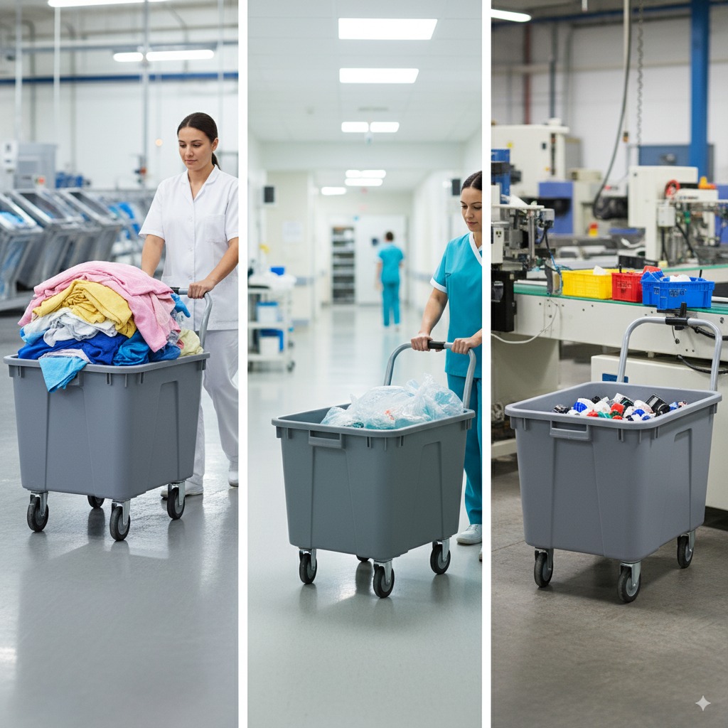 Nos hospitais, clínicas e laboratórios, o carro cuba de plástico é frequentemente usado para o transporte de roupas hospitalares, instrumentos esterilizados e resíduos biológicos. Sua composição resistente a produtos químicos garante a segurança no manuseio.